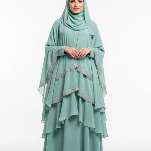 Introducing the Mint Layered Abaya, a masterpiece of modest fashion designed for the modern woman. This exceptional piece features a rich, deep mint tone that effortlessly complements any look.