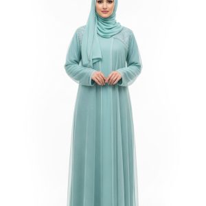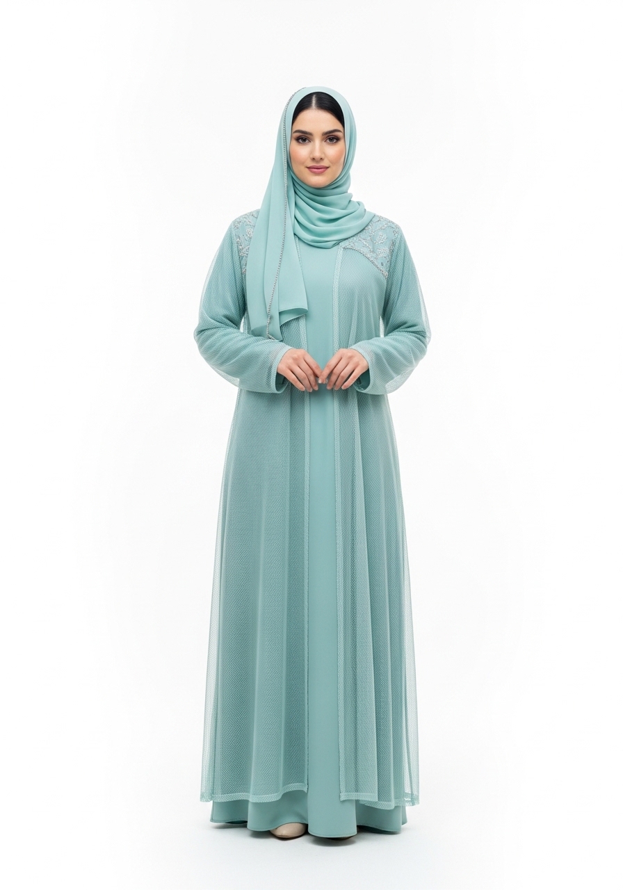 Introducing the Mint Mesh Abaya, a masterpiece of modest fashion designed for the modern woman. This exceptional piece features a rich, deep mint tone that effortlessly complements any look.