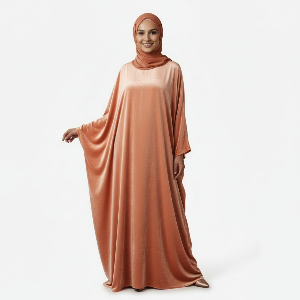 Crafted from premium velvet burkha with a rich lustrous texture and luxurious deep-pile fabric, the Peach Velvet Burkha delivers a graceful, dignified silhouette that flatters all body types. Whether heading to the mosque, a family gathering or a special event – this burkha transitions effortlessly. Ideal for winter weddings, Eid, formal events and premium cold-season modest wear.