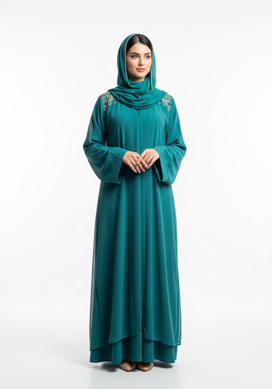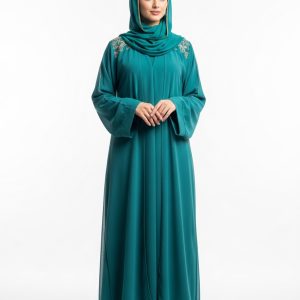 Introducing the Teal Mesh Abaya, a masterpiece of modest fashion designed for the modern woman. This exceptional piece features a rich, deep teal tone that effortlessly complements any look.