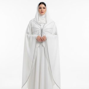Introducing the White Butterfly Abaya, a masterpiece of modest fashion designed for the modern woman. This exceptional piece features a rich, deep white tone that effortlessly complements any look.